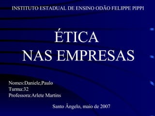 O documento discute a ética nas empresas, abordando o desenvolvimento da ética, os diferentes tipos de ética (social, profissional e individual), as prioridades dos gerentes, a influência da estrutura e cultura da empresa na ética e a necessidade de um código de ética.