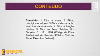O documento discute ética no serviço público. Primeiro, define ética e moral, e como ambos se referem ao comportamento humano orientado por valores e princípios. Segundo, explica que a ética envolve reflexão sobre princípios e valores que orientam condutas. Terceiro, diz que a democracia e o exercício da cidadania refletem o desenvolvimento ético de uma sociedade.