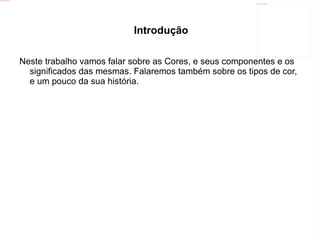 Este documento discute o significado e a história das cores. Explica que as cores primárias são azul, magenta e amarelo e as secundárias são roxo, vermelho e verde. Também descreve fatores como intensidade, tom e matiz que diferenciam as cores e discute esquemas de combinação como a tríade que usa três cores secundárias equidistantes na roda das cores.