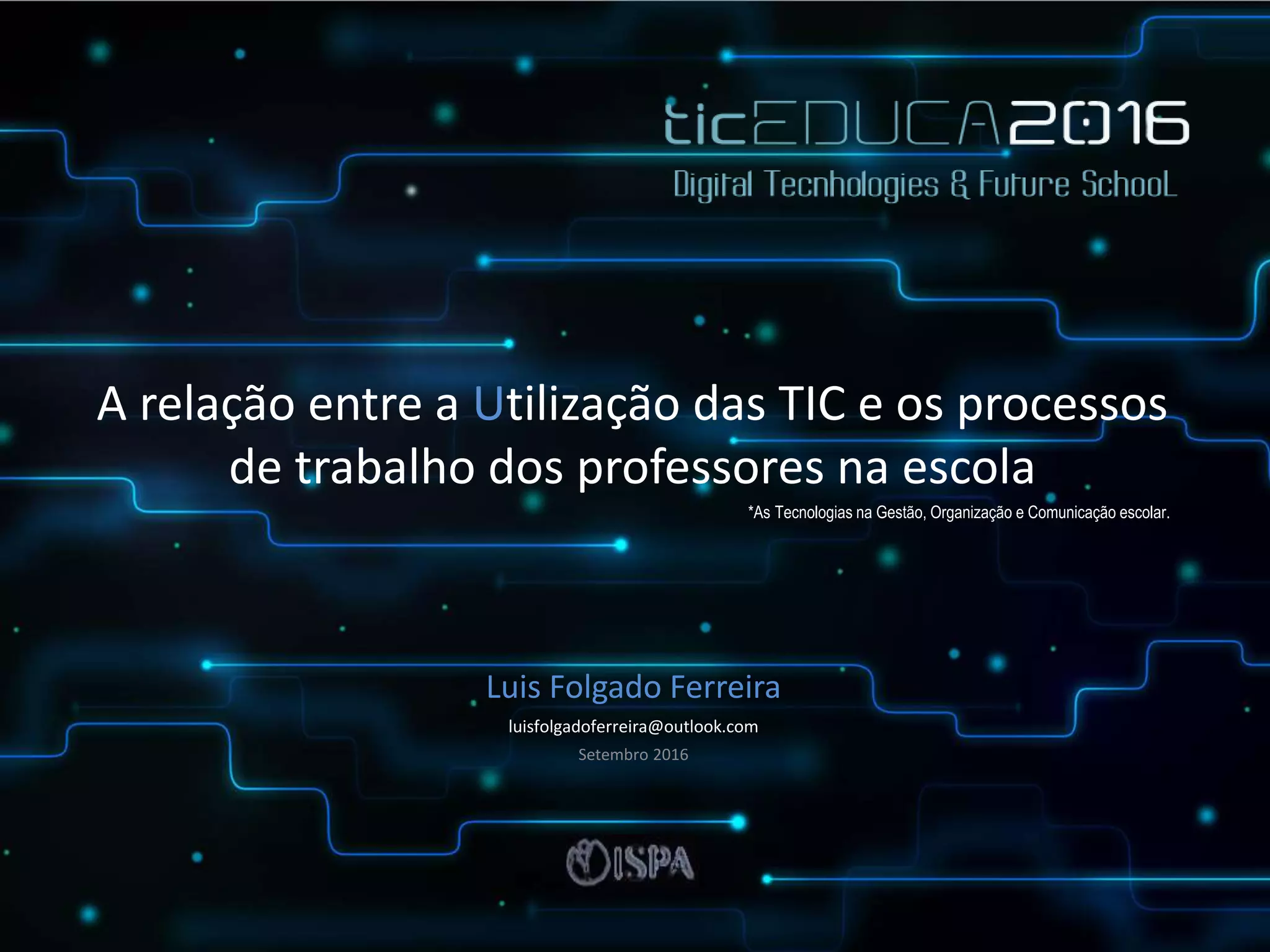 O documento analisa a relação entre a utilização das tecnologias de informação e comunicação (TIC) e os processos de trabalho dos professores nas escolas. Apresenta três hipóteses sobre a influência da facilidade de utilização, percepção de melhoria e atitude na utilização das TIC. Validou um questionário com base no modelo TAM e analisou os dados recolhidos de 1691 respostas de professores, concluindo que existe relação entre estas variáveis e a utilização das TIC.