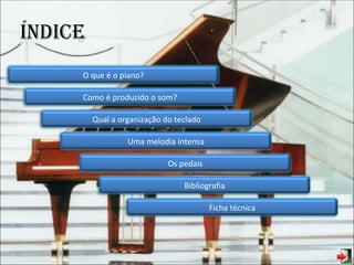 O piano é um instrumento musical de corda percutida cujo som é produzido por martelos que atingem cordas esticadas. Possui um teclado com doze teclas por oitava, sendo brancas as da escala diatônica e pretas os meios-tons. Conta com três pedais que modificam o som produzido pelas cordas.
