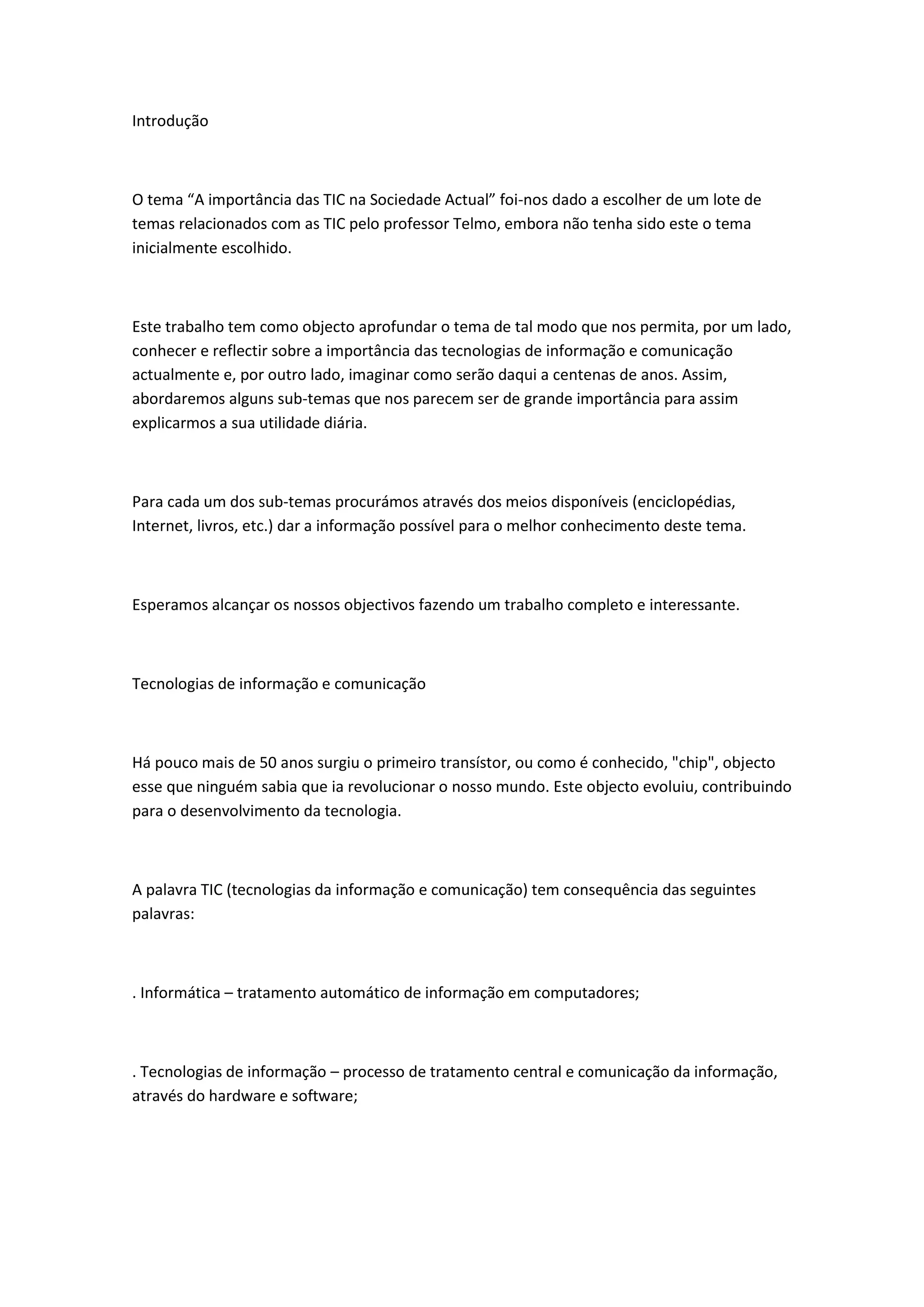 1) O documento discute a importância das tecnologias de informação e comunicação (TIC) na sociedade atual, abordando suas aplicações em diferentes setores como educação, empresas, transporte e no dia-a-dia.