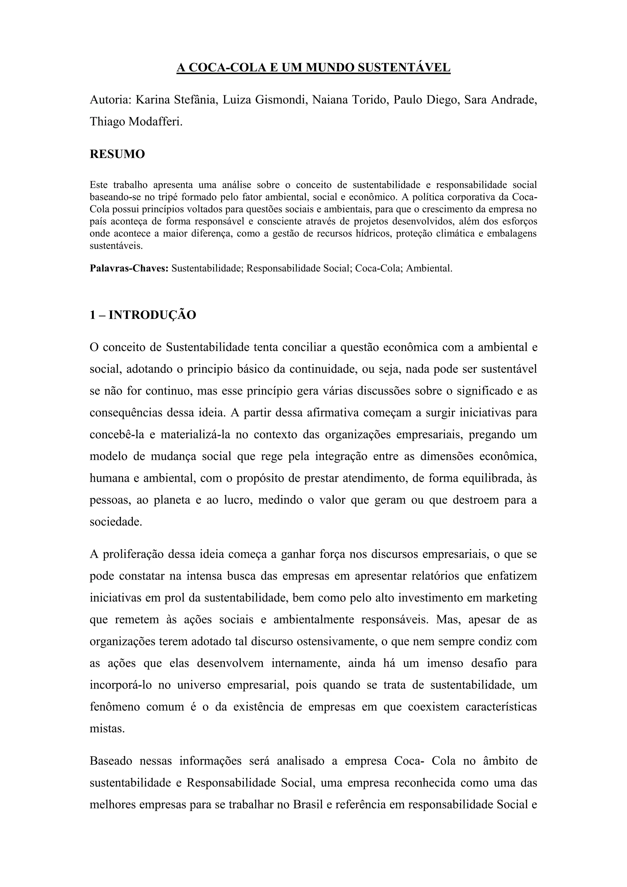 Este documento analisa a sustentabilidade e responsabilidade social da Coca-Cola no Brasil. Apresenta o conceito de desenvolvimento sustentável e discute as ações da Coca-Cola para promover um mundo melhor, como projetos de gestão de recursos hídricos, proteção climática e embalagens sustentáveis. Também descreve a história da Coca-Cola no Brasil e seu compromisso com iniciativas socioambientais.