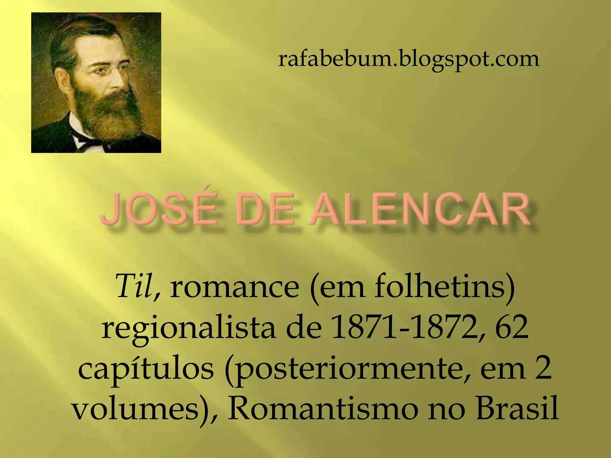 Este documento resume o romance regionalista brasileiro "Til" de 1871-1872, descrevendo seus personagens principais como Berta, Til, Inhá e Jão Fera, além de citar trechos e locações importantes da história.