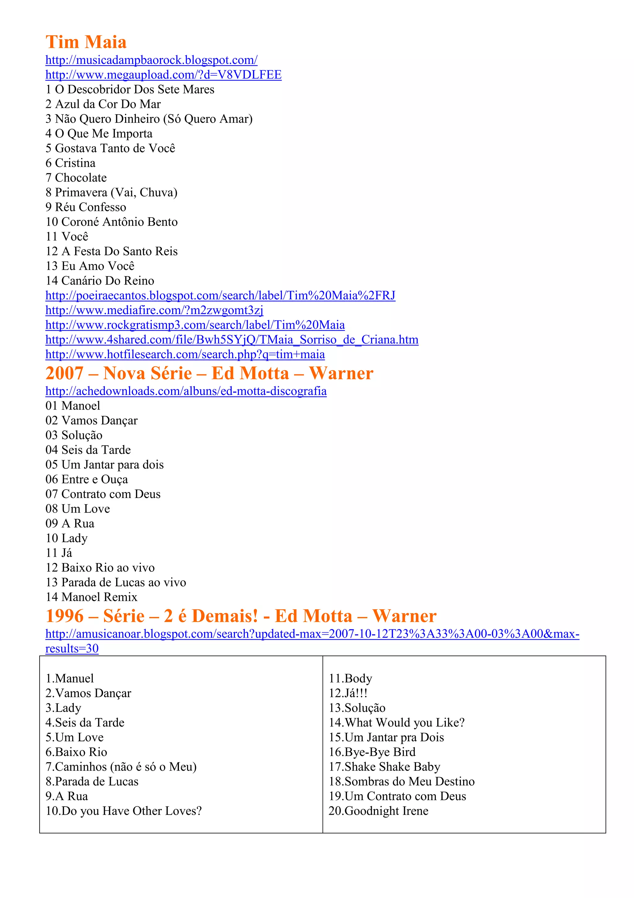 O documento lista várias músicas de Tim Maia e links para downloads e informações sobre o artista. Também lista as faixas dos álbuns "Nova Série" de Ed Motta e "2 é Demais!" também de Ed Motta, com links relacionados.