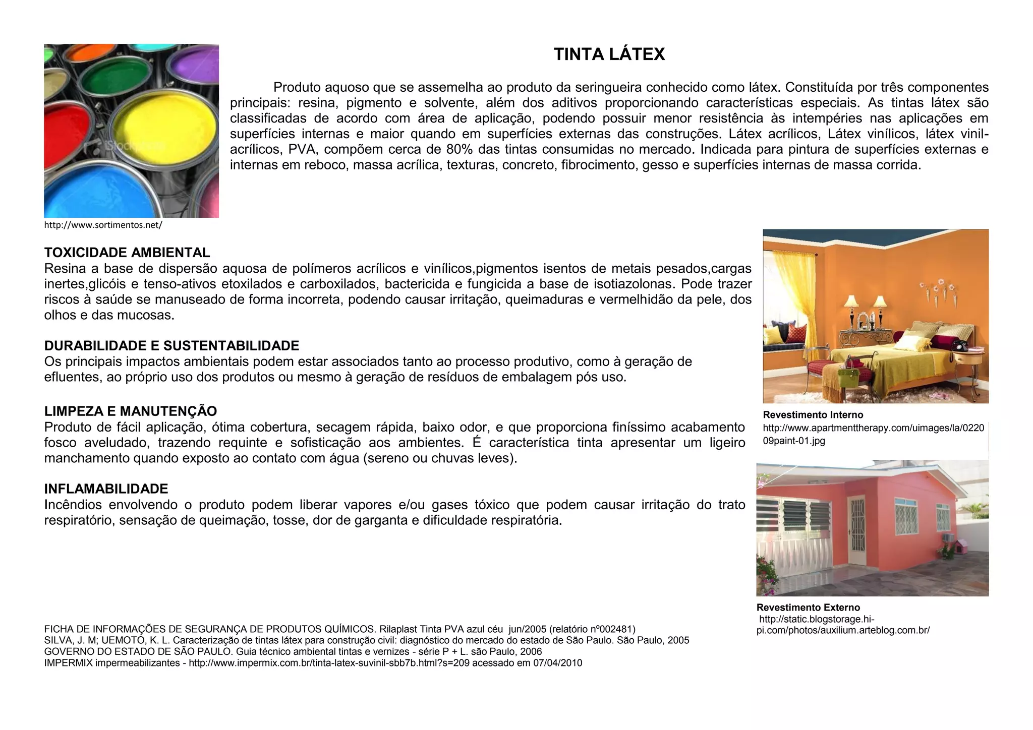 Tinta látex é um produto aquoso à base de polímeros acrílicos e vinílicos que se assemelha ao látex natural. É composta principalmente por resina, pigmento e solvente e é classificada de acordo com a área de aplicação, sendo mais resistente para uso externo. É indicada para pintura interna e externa em diversas superfícies de construção.