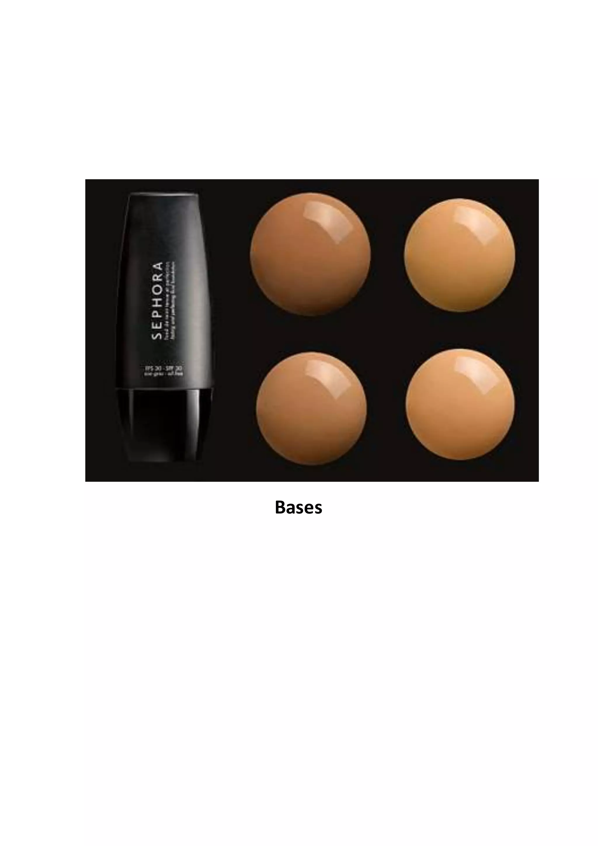 A base uniformiza a maquilhagem e realça a pele, dando-lhe um aspecto saudável e protegendo contra os factores de envelhecimento. As bases são geralmente líquidas e aplicam-se com pincel ou esponja, podendo depois aplicar-se pó compacto para maior duração. A cor da base deve coincidir com a cor natural da pele.