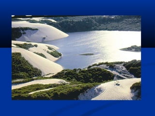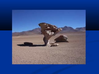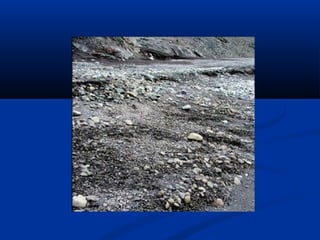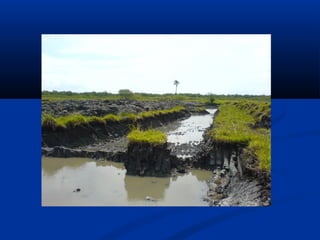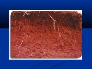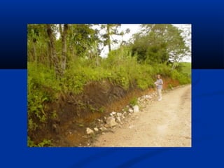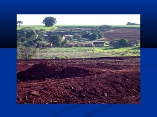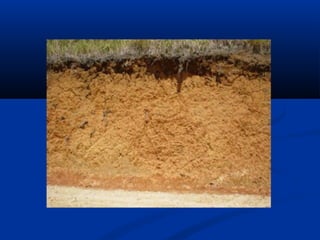 Este documento descreve a formação e tipos de solos. Os solos se formam pela decomposição de rochas através de processos mecânicos e químicos. Existem três tipos principais de solos: residuais, sedimentares e orgânicos. O documento também explica como identificar visualmente diferentes tipos de solos como areia, silte e argila.