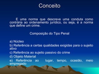 O documento descreve os conceitos de tipo penal e seus elementos constitutivos. O tipo penal define uma conduta como crime e contém: (1) o núcleo da ação, (2) referências ao sujeito ativo e passivo, (3) objeto material, e (4) referências a tempo e local. Os elementos do tipo penal são: (1) objetivo, (2) normativo e (3) subjetivo. A ausência de um elemento pode caracterizar atipicidade, tornando o ato não punível.