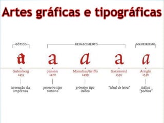 O documento discute a história da tipografia e artes gráficas em Portugal, desde as primeiras tipografias estabelecidas em 1495 em Leiria e Faro até a produção contemporânea de revistas, catálogos e outros materiais de comunicação gráfica pela Gráfica Vilar do Pinheiro.