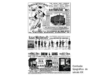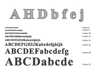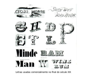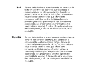 O documento discute a história da tipografia desde os primeiros alfabetos até a invenção dos tipos móveis por Gutenberg no século 15. Também aborda conceitos como família tipográfica, classificação de tipos, espaçamento, alinhamento e outros elementos que afetam a legibilidade.