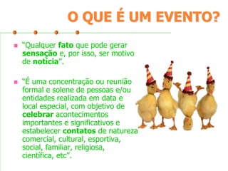 O documento apresenta uma introdução sobre conceitos e classificação de eventos, seguida de uma tipologia detalhada de diversos tipos de eventos como congressos, conferências, exposições, coquetéis e outros, descrevendo suas principais características.