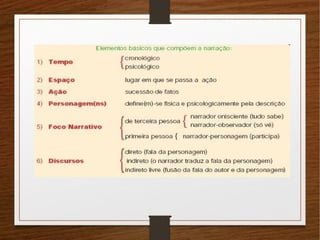 O documento aborda a importância da tipologia e dos gêneros textuais em nossa comunicação cotidiana, explicando suas definições e diferenças. Apresenta exemplos de tipologias textuais, como narração, descrição, dissertação, exposição e injunção, e descreve as características específicas de cada uma. Também discute o papel do narrador, a estrutura das narrativas e destaca a relevância de conhecer e classificar os textos que encontramos na sociedade.