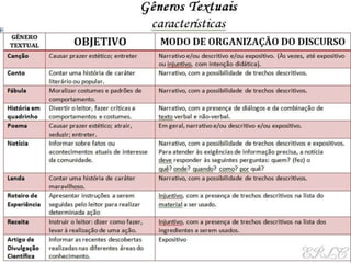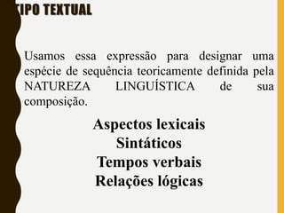 O documento discute tipologia textual e gêneros textuais. Explica que a tipologia textual se refere aos tipos de organização de um texto baseados em aspectos linguísticos, enquanto os gêneros textuais são textos materiais encontrados no cotidiano com características sócio-comunicativas definidas. Apresenta exemplos de tipos textuais como narrativo, descritivo, dissertativo e injuntivo, e de gêneros como carta, diário e e-mail.