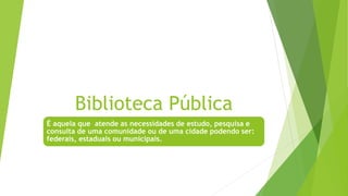 O documento descreve os diferentes tipos de bibliotecas: públicas, nacionais, especializadas, escolares, infantis, universitárias e especiais. Ele explica que as bibliotecas públicas atendem às necessidades de estudo e pesquisa da comunidade, enquanto as nacionais preservam a produção bibliográfica e documental de uma nação. As especializadas atendem grupos específicos, como universitárias e técnicas. As escolares complementam o ensino e incentivam a leitura. As infantis estimulam a imaginação e o