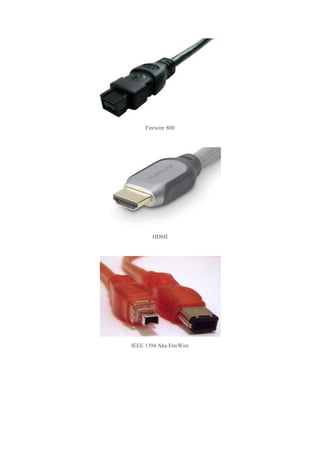 O documento descreve diferentes tipos de cabos e conexões de vídeo e áudio usados em computadores, incluindo VGA, DVI, S-Video, Component Video, FireWire, USB e conexões de rede sem fio. Ele fornece detalhes sobre cada conector e sua função.