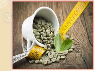 O documento discute os vários tipos de café, destacando o extrato de café verde como uma fonte poderosa de antioxidantes e um auxílio eficaz na perda de peso, demonstrando reduzir o IMC e a gordura corporal em indivíduos obesos. Estudos mostram que o extrato de café verde pode aumentar a queima calórica e levar à perda de peso significativa sem alterações na dieta e exercícios. É recomendado consultar um médico antes de iniciar o uso de suplementos de café verde devido à variabilidade nas doses e efeitos.