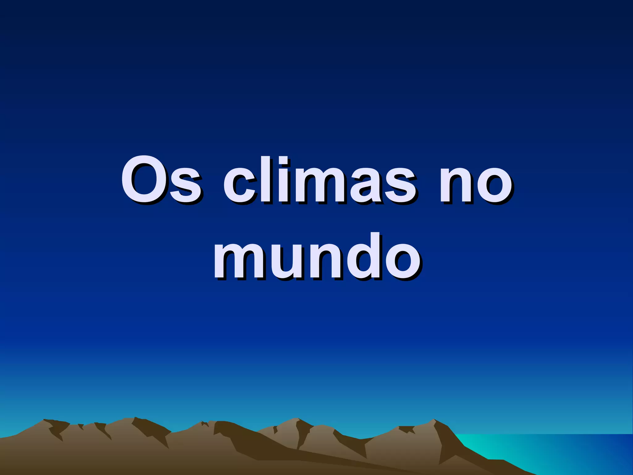 O documento descreve os principais climas do mundo, divididos em quatro categorias: climas quentes (equatorial, tropical e subtropical), climas secos, climas temperados (continental, oceânico e mediterrâneo) e clima frio (polar, de montanha e continental). Detalha as características climáticas e a distribuição geográfica de cada um desses climas.