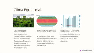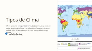 O documento apresenta a diversidade climática da Terra, descrevendo os principais tipos de clima, como o equatorial, tropical húmido, tropical seco, desértico quente, temperado mediterrânico, temperado marítimo, temperado continental, subpolar e polar. Cada clima possui características específicas que influenciam a vegetação, fauna e a vida local. A apresentação destaca a importância dessas variações climáticas nos ecossistemas do planeta.