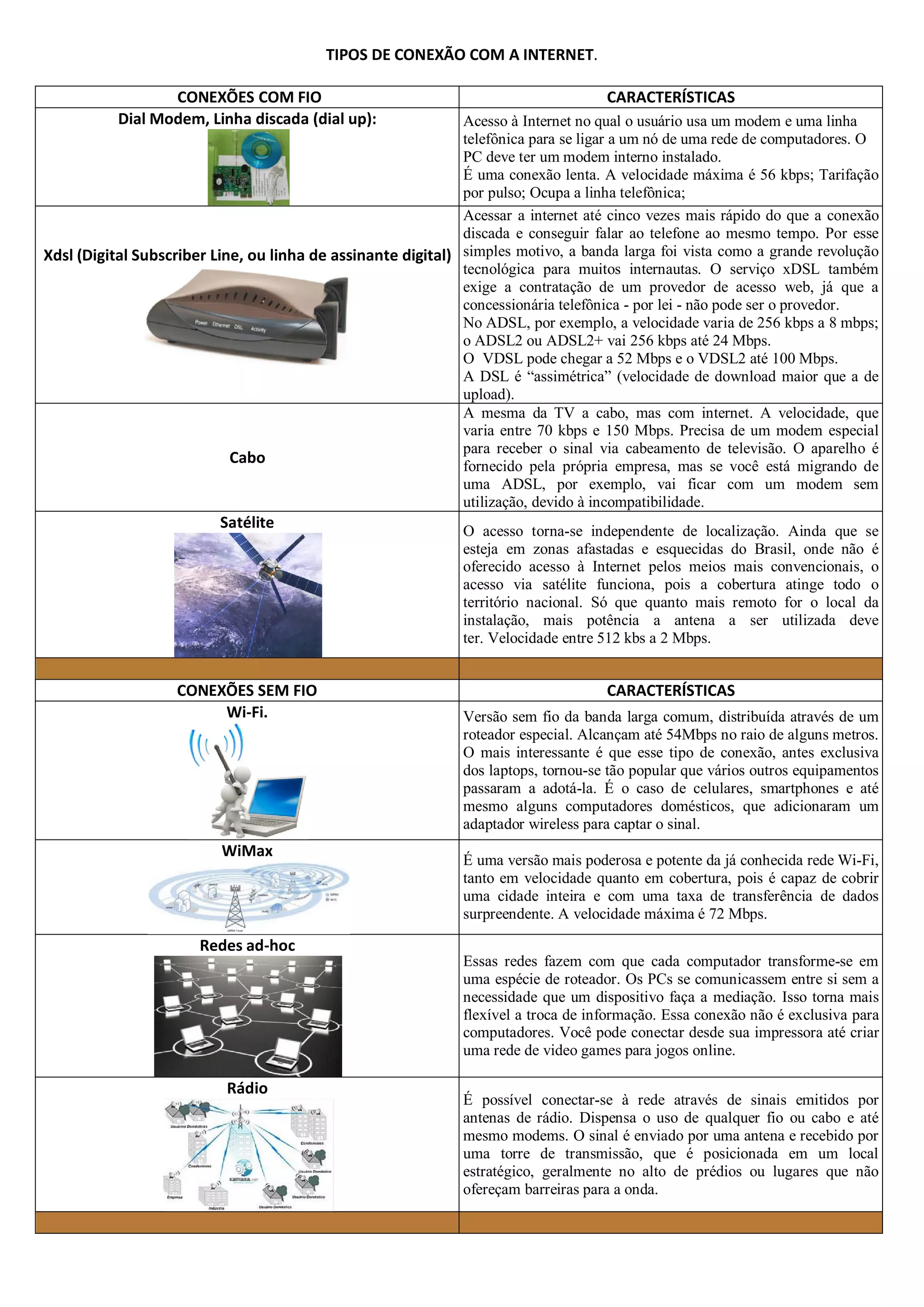 O documento descreve os principais tipos de conexão à internet, divididos em conexões com fio e sem fio. Entre as conexões com fio, estão a discada, ADSL, cabo e satélite. As conexões sem fio incluem Wi-Fi, WiMax, redes ad-hoc e rádio. Também apresenta as características da internet móvel por WAP, Bluetooth, EDGE, 3G e LTE.