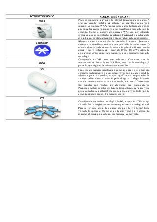 O documento descreve os principais tipos de conexão à internet, divididos em conexões com fio e sem fio. Entre as conexões com fio estão discadas, DSL, cabo e satélite. As conexões sem fio incluem Wi-Fi, WiMax, redes ad-hoc e rádio. Também apresenta as características da internet móvel por WAP, Bluetooth, EDGE, 3G e LTE.
