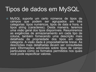 O documento descreve os tipos de dados suportados pelo MySQL, incluindo tipos numéricos, de data e hora, e strings. Ele explica as categorias de tipos de dados, requisitos de armazenamento, e como escolher o tipo correto para cada coluna para armazenamento eficiente. O documento também compara os tipos de dados do MySQL com outros sistemas como o MS Access.