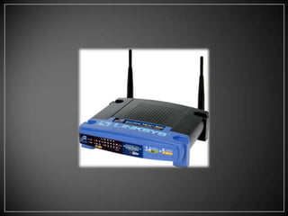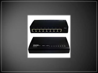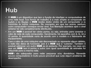 O documento descreve diferentes tipos de dispositivos de rede, incluindo Hubs, Switches, Routers, Placas de Rede, Cartões Wireless PC, Pontos de Acesso e Wi-Fi. Cada dispositivo tem uma função específica na transmissão e recepção de dados em uma rede.