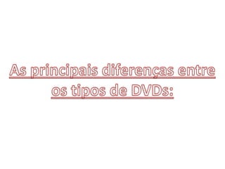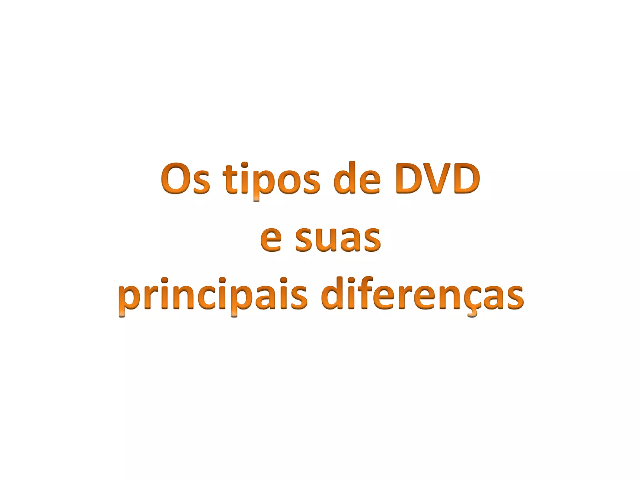 Os principais tipos de DVD são DVD-ROM, usado para armazenar filmes sem regravação; DVD-RAM, que permite mais de 100 mil gravações e regravações; e Dual Layer/Double Layer, que armazenam 8,5GB gravando em ambos os lados do DVD.