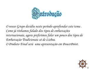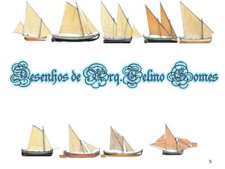 O documento descreve vários tipos de embarcações tradicionais encontradas no estuário do Tejo, incluindo suas características, funções e dimensões. Detalha embarcações como fragatas, faluas, caíques, batelões e varinos, explicando como eram usadas para pesca, transporte e navegação no rio.