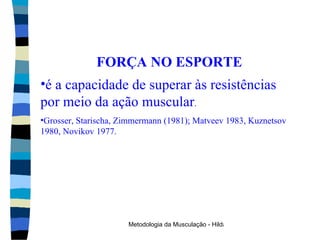 O documento discute os diferentes tipos de força, incluindo força geral vs local, dinâmica vs estática, máxima vs rápida, absoluta vs relativa ao peso corporal. Também discute o treinamento da força e os riscos de lesões associados ao desenvolvimento da força em um microciclo.