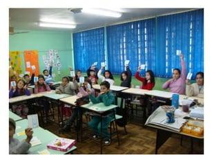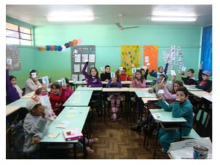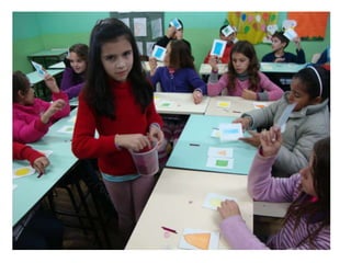 O documento discute diferentes tipos de frases e formas geométricas para ajudar na aprendizagem de crianças. Ele também destaca a importância da diversão, aplicação prática, avaliação, concentração e cores para engajar as crianças no aprendizado.