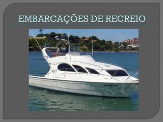 O documento classifica e descreve diferentes tipos de navios, incluindo navios de guerra como cruzadores e fragatas, navios mercantes como cargueiros e petroleiros, embarcações de recreio, e navios especiais como reboqueiros e navios de combate à poluição.