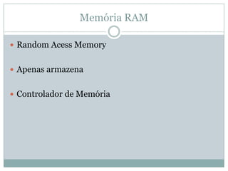 O documento discute as evoluções das memórias RAM, começando pelas memórias SDRAM, DDR SDRAM, DDR1, DDR2 e DDR3. A tecnologia DDR permite transferir dados em ambas as fases do clock, dobrando a taxa de transferência em relação às memórias SDRAM. As gerações posteriores trouxeram pré-busca de mais bits, menores latências e consumo, tornando as memórias mais rápidas a cada geração apesar de operarem a frequências internas menores.