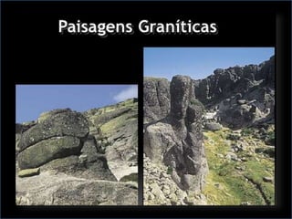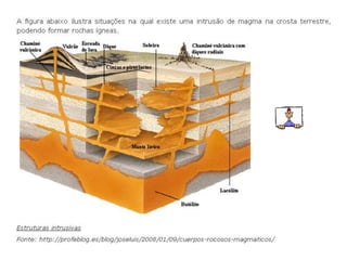As rochas são classificadas em três grupos principais: magmáticas, sedimentares e metamórficas, com cada tipo de rocha tendo processos de formação distintos. As rochas ígneas se originam do resfriamento do magma, as sedimentares se formam pela compressão de sedimentos, e as metamórficas resultam da modificação de outras rochas sob calor e pressão. Cada grupo possui características e exemplos, como granito (ígnea), arenito (sedimentar) e gnaisse (metamórfica).