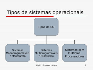 O documento aborda os diferentes tipos de sistemas operacionais, classificando-os em monoprogramáveis e multiprogramáveis, assim como suas características e exemplos. Além disso, são discutidas as formas de classificação em relação ao número de usuários, processos, e tipos de processamento, incluindo sistemas de tempo real e sistemas batch. Por fim, menciona as máquinas virtuais e a estrutura de sistemas com múltiplos processadores.