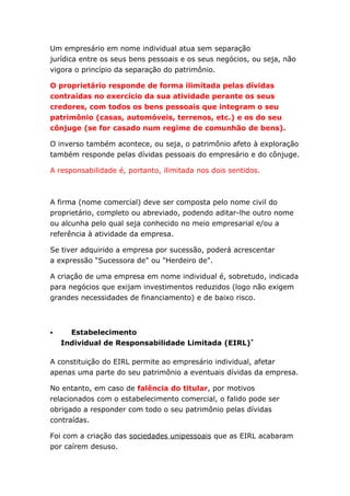 O documento descreve os principais tipos de sociedades comerciais em Portugal, incluindo empresas individuais, sociedades unipessoais e sociedades com mais de um sócio. Explora as diferenças na responsabilidade dos proprietários/sócios, capital social mínimo e outras características entre empresas individuais, sociedades unipessoais, sociedades coletivas e sociedades anônimas.