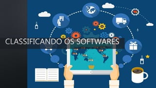 O documento descreve diferentes componentes de um computador, incluindo a parte lógica, física e o papel do usuário. Ele aborda tipos de software, como aplicativos, utilitários, freeware, shareware, programas beta e demos. Cada tipo de software possui características específicas relacionadas ao seu uso e distribuição.
