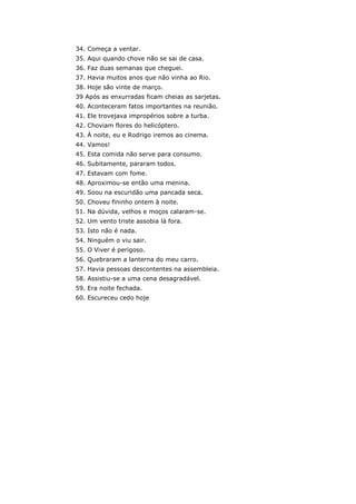 Este documento fornece exemplos de exercícios para identificar e classificar o sujeito e o predicado nas orações. Inclui um texto com 55 orações para identificar o sujeito e 30 orações para identificar o tipo de predicado, além de fornecer o gabarito com as respostas.