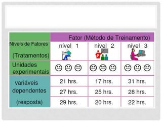 1) O documento descreve os conceitos básicos da Análise de Variância (ANOVA), incluindo tratamentos, unidades experimentais, repetições e variável resposta.