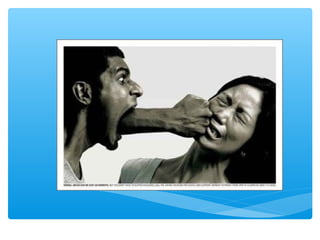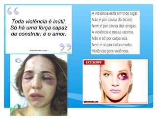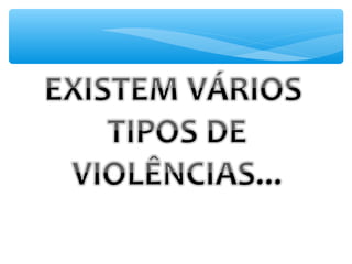 O documento discute vários tipos de violência como violência doméstica, violência contra crianças, e bullying. Ele enfatiza que a violência gera mais violência e pede para dizer não para a violência.