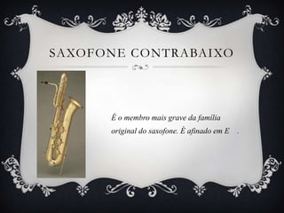 O documento descreve os diferentes tipos de saxofone, desde o mais grave, o contrabaixo, até o mais agudo, o soprillo. Cada tipo de saxofone é definido por sua afinagem, extensão e uso em diferentes contextos musicais como jazz, música erudita e conjuntos.
