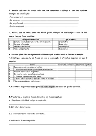 Este documento fornece instruções sobre os diferentes tipos e formas de frases em português. Discute frases declarativas, interrogativas, exclamativas e imperativas, positivas e negativas. Inclui exercícios para identificar e construir diferentes tipos de frases.