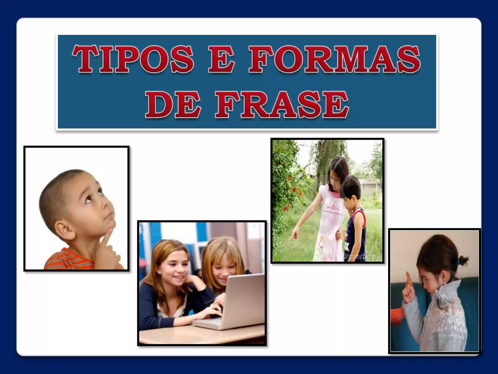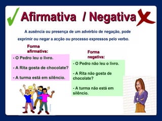 Existem quatro tipos de frase - declarativa, interrogativa, exclamativa e imperativa - definidos pela intenção do falante. As frases também possuem diferentes formas de expressão que acompanham o tipo de frase. O documento discute os tipos e formas de frase e fornece exercícios sobre cada um.