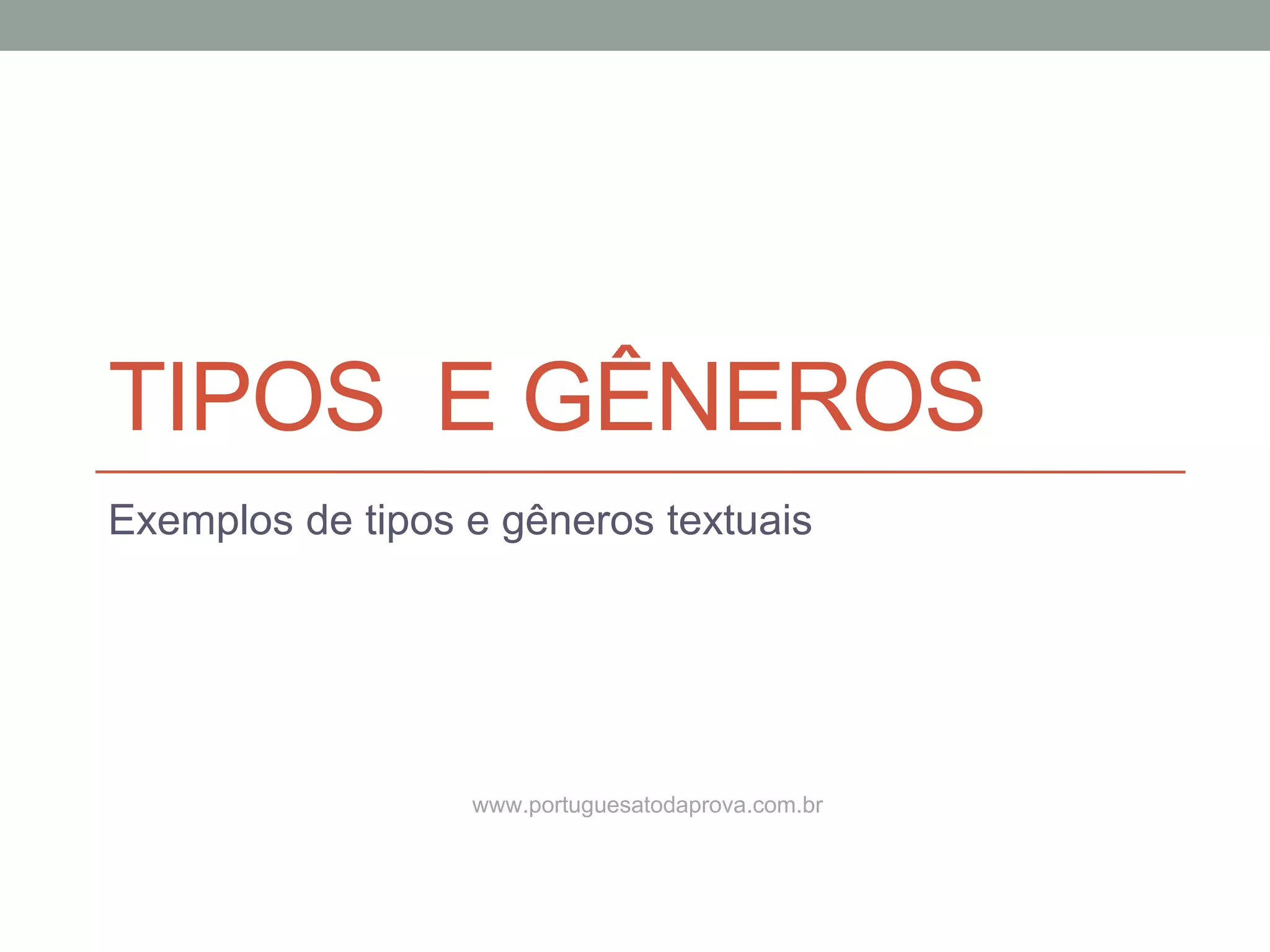 O documento explora diferentes tipos e gêneros textuais, destacando suas características, estruturas e finalidades. A tipologia textual é dividida em narrativo, descritivo, argumentativo, dissertativo/expositivo e injuntivo, cada um com suas peculiaridades. Exemplos de vários tipos textuais são apresentados, mostrando como a narrativa e a descrição podem ser aplicadas em diversos contextos.