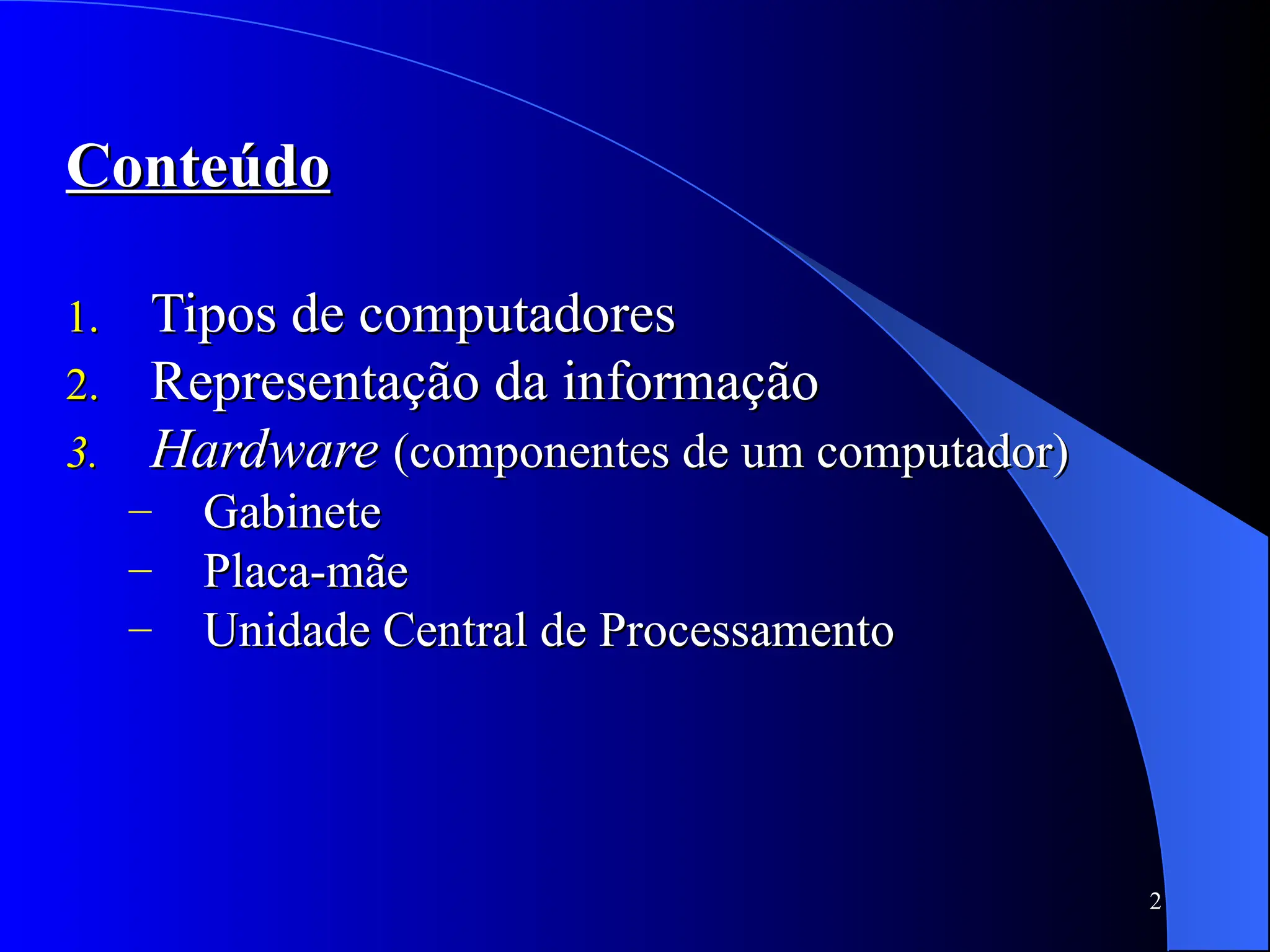 O documento aborda os fundamentos da informática, detalhando tipos de computadores, como supercomputadores, mainframes e computadores pessoais, além de discutir a representação da informação através do sistema binário e a funcionalidade do hardware, incluindo gabinete, placa-mãe e CPU. Os tipos de computadores são classificados de acordo com suas capacidades e aplicações, enquanto a representação de dados utiliza bits e bytes para descrever como as informações são processadas. A estrutura do hardware é explicada com ênfase nas funções dos componentes principais e nos padrões de desempenho.