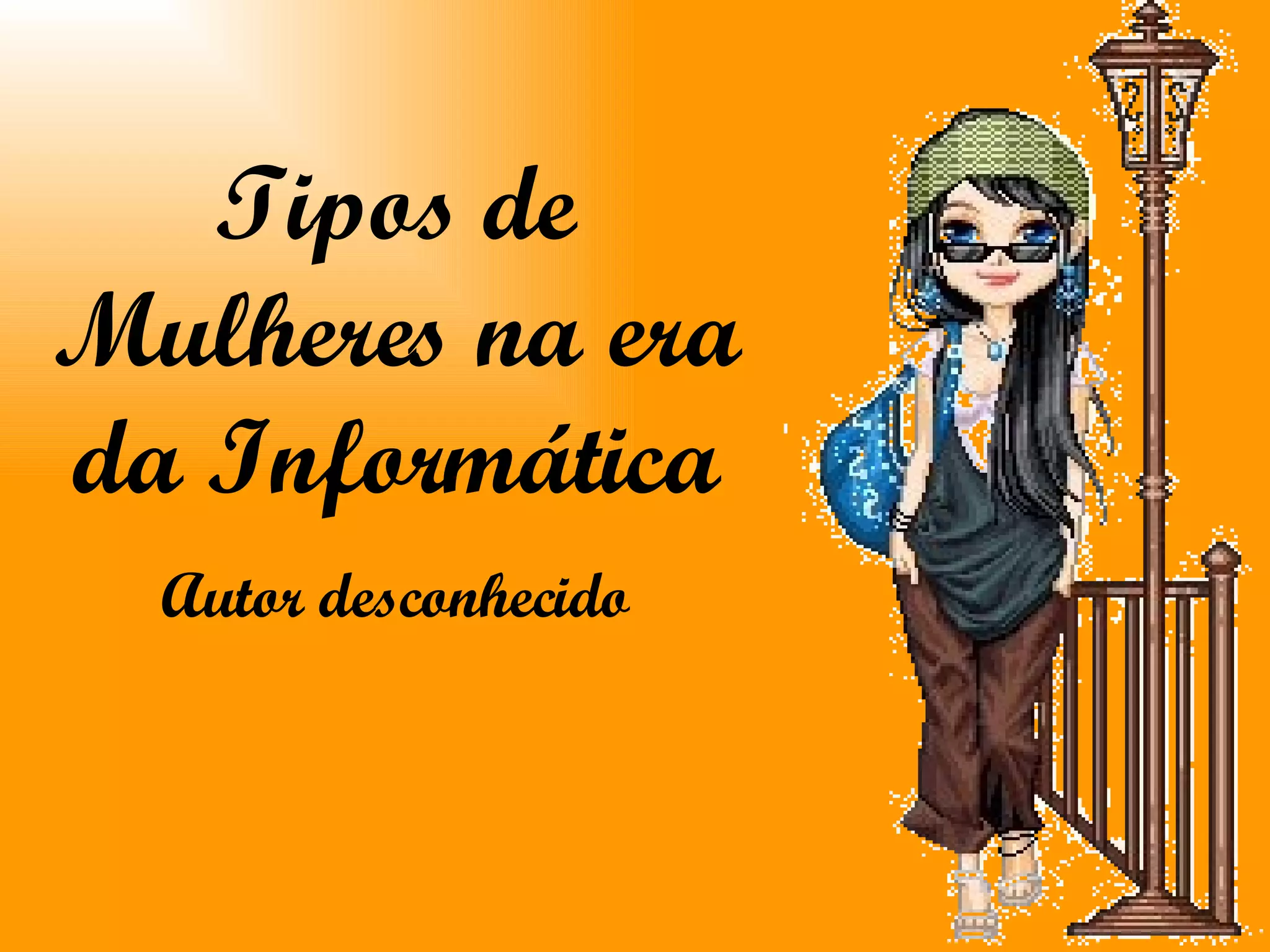 Este documento faz uma analogia entre diferentes tipos de mulheres e conceitos da era da informática. Compara mulheres a conceitos como a internet, servidores, sistemas operacionais, programas de apresentação, planilhas, processadores de texto e vírus de computador, atribuindo características estereotipadas a cada uma.