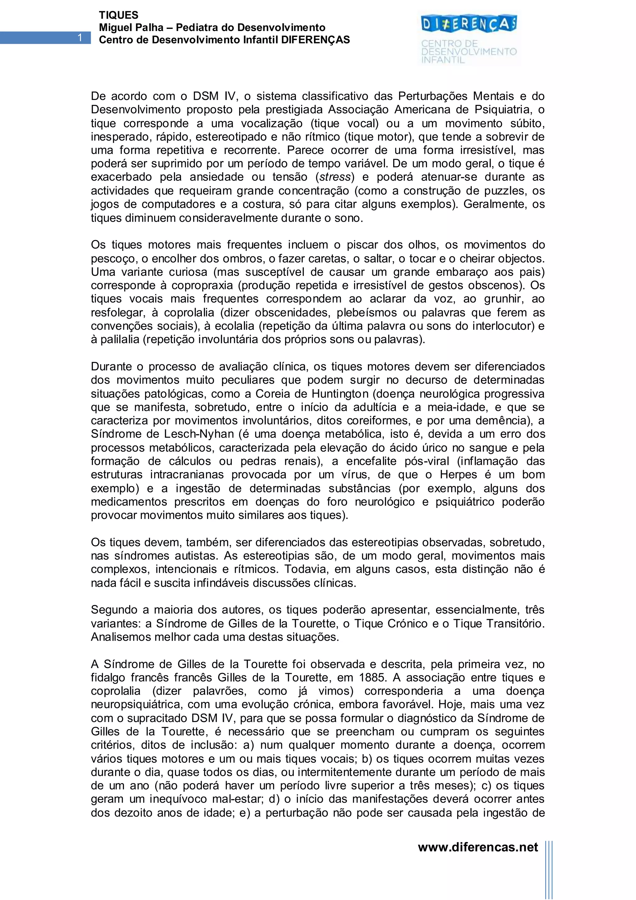 O documento discute os tiques, distinguindo-os de outros movimentos involuntários e definindo três variantes principais: a Síndrome de Gilles de la Tourette, o Tique Crônico e o Tique Transitório. A Síndrome de Gilles de la Tourette é caracterizada por múltiplos tiques motores e vocais por mais de um ano. O Tique Crônico é similar, mas com apenas tiques motores ou vocais. O Tique Transitório dura de 4 semanas a 1 ano.