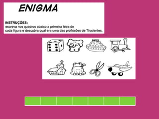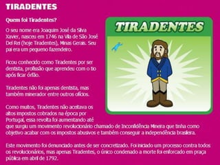 Tiradentes foi um militar e líder da Inconfidência Mineira que lutou pela independência de Minas Gerais de Portugal no século 18. Ele foi preso em 1789 e enforcado três anos depois aos 46 anos de idade em 21 de abril, feriado nacional em sua homenagem. Sua última frase refletia seu sonho de um Brasil maior e livre da colonização portuguesa.