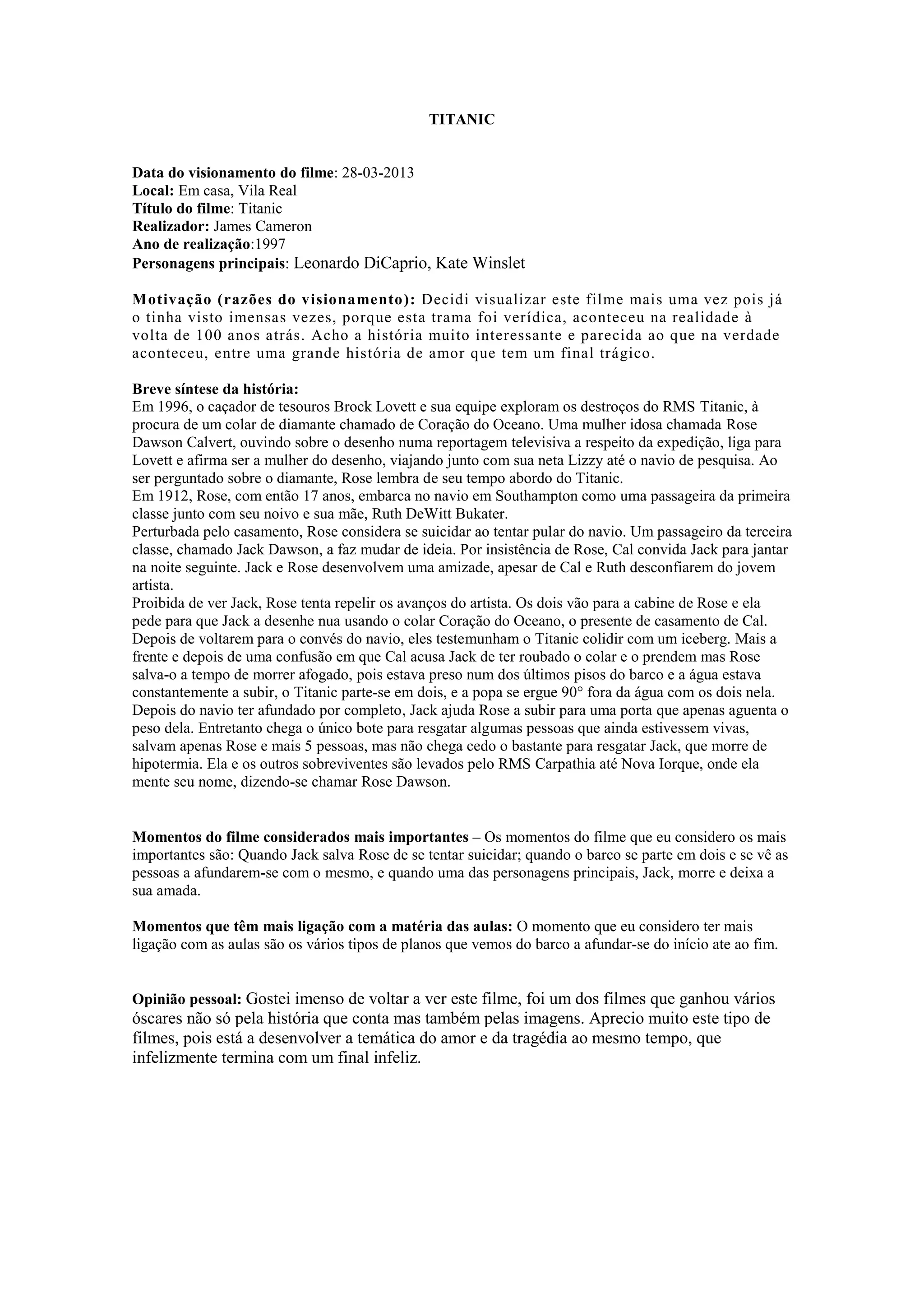 O filme Titanic conta a história verídica do naufrágio do navio RMS Titanic em 1912. A protagonista Rose embarca no Titanic com seu noivo Cal e mãe Ruth, mas desenvolve uma paixão proibida pelo passageiro da terceira classe Jack Dawson. Quando o Titanic colide com um iceberg, Jack ajuda Rose a sobreviver, mas morre de hipotermia enquanto aguardava resgate. Rose vive o resto de sua vida escondendo sua história de amor com Jack.