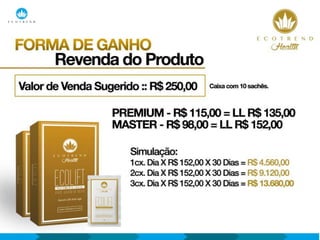 Este documento apresenta uma proposta de negócios para consultoria e franquia da empresa Ecotrend. Apresenta os pacotes de consultoria, incentivos, prêmios e plano de carreira para quem se tornar consultor ou franqueado da empresa.